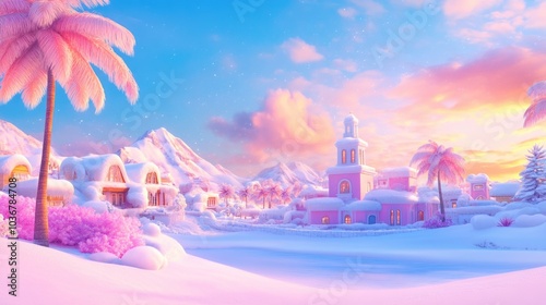 Obraz premium Tropical winter wonderland: pink snow village at sunset