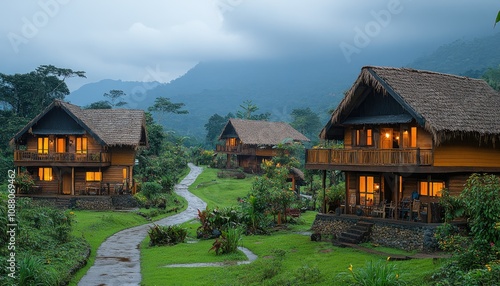 © Lhouis, Fototapeta premium Tropical wooden cabins with lit windows. Perfect for illustrating a secluded vacation getaway.