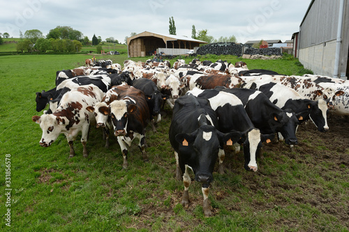 Fototapeta premium Troupeau de vaches empruntant le chemin de la traite...Race normande et prim holstein.
