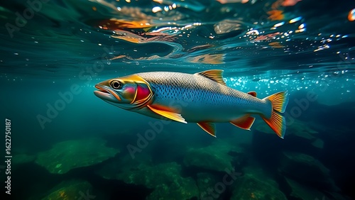 Naklejka premium Trout gliding through a clear mountain stream, sunlight creating patterns in the blue-green water.