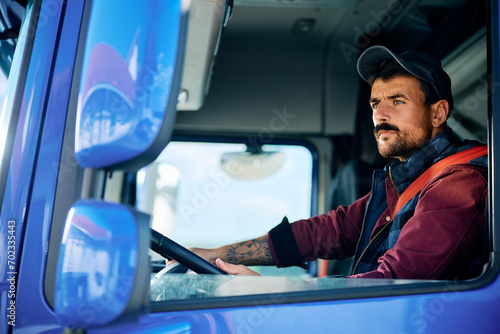 © Drazen, Obraz premium Truck driver looking at side view mirror while driving in reverse.
