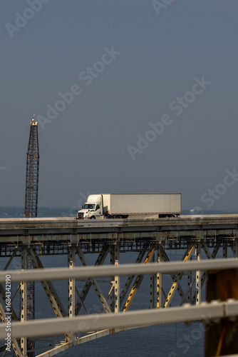 © Volodymyr, Obraz premium Truck driving across the bridge. Lorry transporting. Cargo trailer. Logistics truck, international shipment. Truck transport. Semi truck containers, logistics industry. Trucks lorry logistic concept.