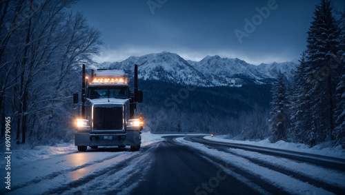 Obraz premium Truck driving on winter night road logistic