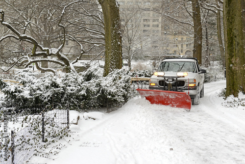 © nyker, Naklejka premium Truck plowing snowy road after snowstorm