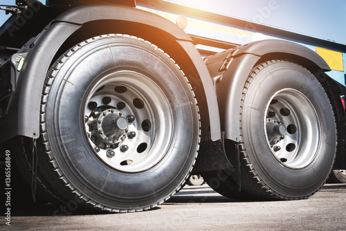 © Siwakorn1933, Obraz premium Truck Wheels Tires. Big rig, Semi Trailer Truck Wheels. Freight Truck Logistics Transportation.
