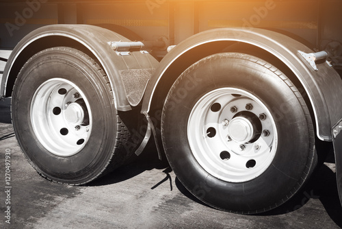 © Siwakorn1933, Obraz premium Truck Wheels Tires. Big rig, Trailer Truck Wheels. Freight Truck Logistics Transportation.