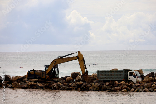 © Andri, Fototapeta premium Trucks and excavators are working to unload material for a reclamation project on the coast of Bali, Indonesia. the process of making embankments on the beach to anticipate abrasion.