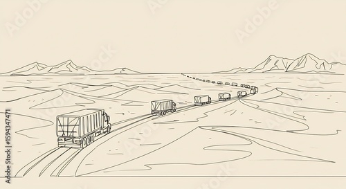 © liliek, Obraz premium Trucks Moving Across a Desert Landscape Sketch Illustration