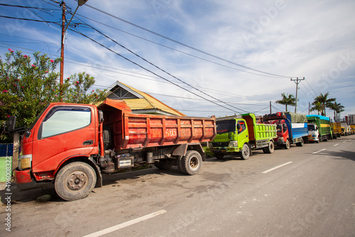 © Sony Herdiana, Obraz premium Trucks queue to refuel near a gas station in Palu City, Central Sulawesi, Indonesia. These trucks deliver various goods to cities in Central Sulawesi Province.