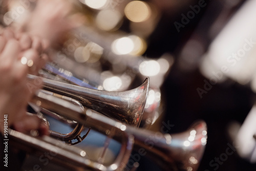 Obraz premium Trumpet bells of a large trumpet section in a wind ensemble or wind band