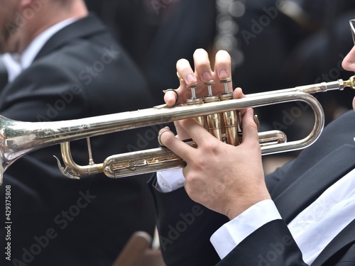 Obraz premium trumpet in the hands of a musician during a classical music concert