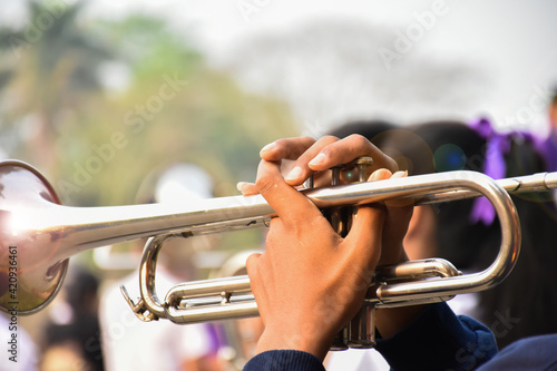 Obraz premium Trumpet instrument holding in hands of Asian student who playing it at a ceremony to honor the national flag in the morning. Soft and selective focus on trumpet.