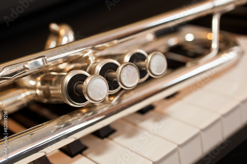 © furtseff, Naklejka premium Trumpet segment closeup lying on piano keys