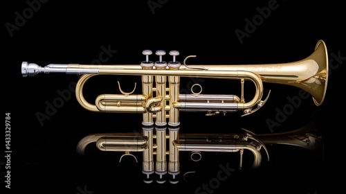 © Artittaya, Fototapeta premium Trumpet valves and mouthpiece highlighted against a smooth reflective background