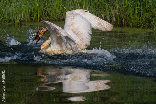 Obraz premium Trumpeter Swan Chases Canada Goose