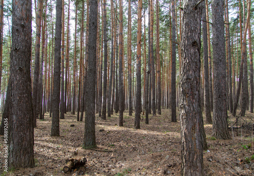 Obraz premium Trunks of coniferous trees in the forest as a background.