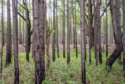 Obraz premium trunks of pine and eucalyptus trees in the forest, side by side