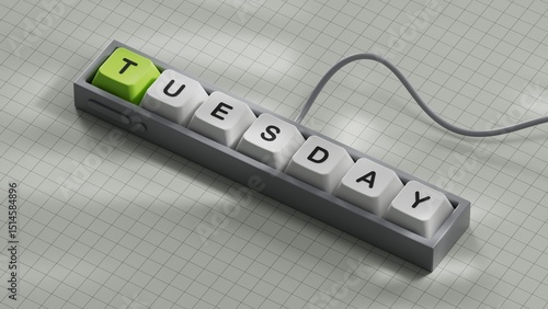 © bo, Fototapeta premium Tuesday.Computer keyboard keys spelling.Flat lay view with computer keyboard keys buttons.IT technology concept.3D rendering on white background.