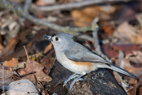 © George Schmiesing, Obraz premium Tufted titmouse standing on a decaying log having picked up a seed in its beak