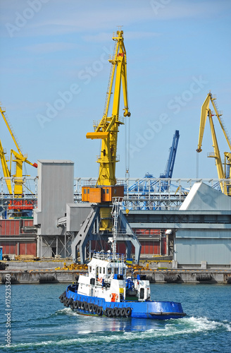 Fototapeta premium Tugboat and port cargo crane