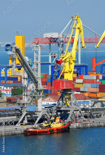 © Unkas Photo, Fototapeta premium Tugboat and port cargo crane