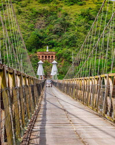 Fototapeta premium Tuk tuk car crossing the iconic Western Bridge, a symbol of Santa Fe de Antioquia