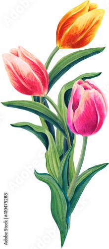© lyubovyaya, Fototapeta premium Tulip Bouquet.Watercolor floral illustration on the white background.