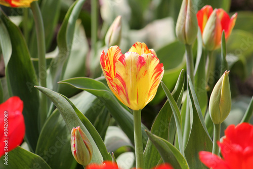 Fototapeta premium Tulip broken by viruses. Variegated colors produced by Tulip Breaking Virus (mosaic virus)