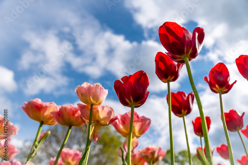Obraz premium Tulip field. Beautiful blooms from low angle. Beautiful spring day with blue sky and white clouds.