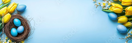 © Arthur Woods, Obraz premium Tulip flower and easter eggs on blue background