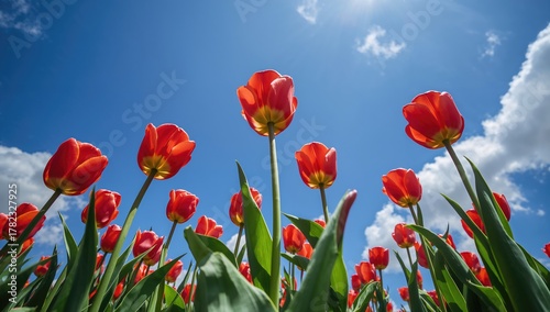 © ArtificialHorizons, Naklejka premium Tulip flowers blooming under the sky, vibrant colors and natural beauty, seasonal change