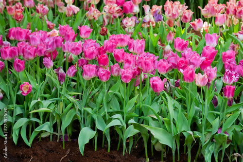 © Patcharida, Fototapeta premium Tulip flowers meadow, tulip spring nature background