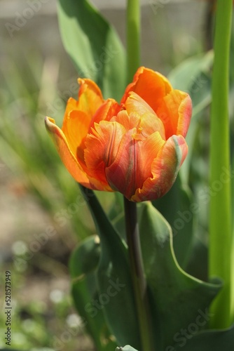 Fototapeta premium Tulip "Orange Princess" is a lovely peony-flowered tulip featuring light...