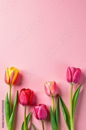 © Temteen, Fototapeta premium Tulip stems and leaves scattered on a soft pink background with subtle texture, colorful, pink