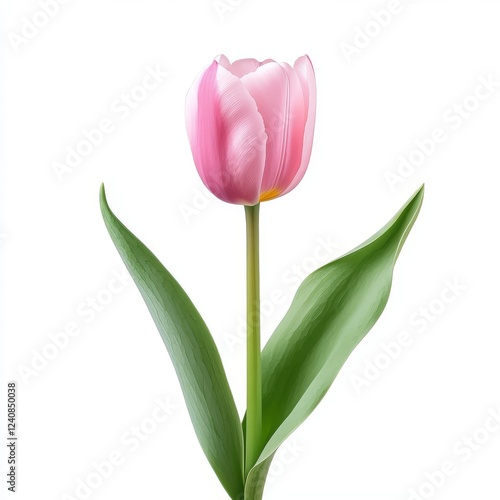 Fototapeta premium tulip with pink bud with stem and leaves, isolated on white background, front view, realistic photo