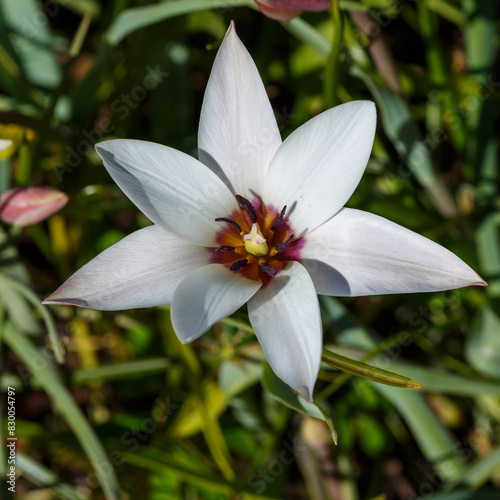 Obraz premium Tulipa clusiana Peppermint Stick in spring garden. Growing bulbs in the garden