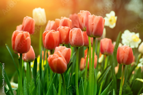 © meegi, Obraz premium tulipany pomarańczowe, wiosenne kwiaty w promieniach wschodzącego słońca w ogrodzie