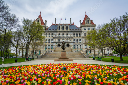 © jonbilous, Obraz premium Tulips and The New York State Capitol, in Albany, New York.
