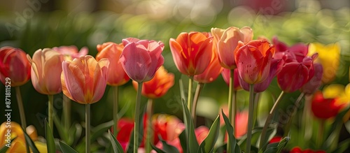 Obraz premium Tulips blooming beautifully in a colorful array amidst green foliage, perfect...