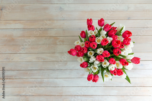 Fototapeta premium Tulips flowers a bouquet of flowers wooden background