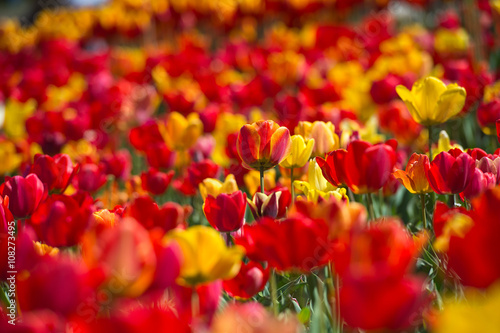 © darkfreya, Fototapeta premium Tulips in garden in sunny day. Spring flowers. Gardening