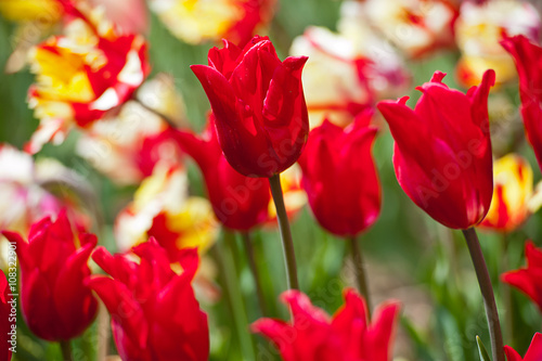 © darkfreya, Fototapeta premium Tulips in garden in sunny day. Spring flowers. Gardening
