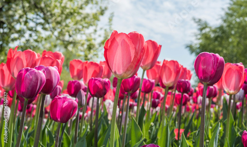 © evgeny, Obraz premium Tulips on the field. Photographed against the sun.