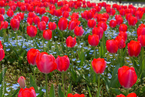 Fototapeta premium Tulips with bright red flowers in spring.