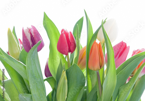 Fototapeta premium Tulips with different colors and green leaves and stems