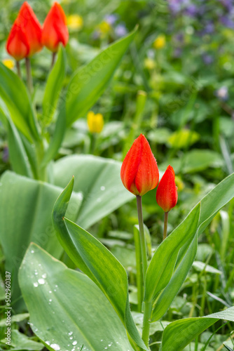 © Liudmila Zavialova, Fototapeta premium Tulips with red buds on a flower bed in the park closeup