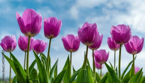 © Wajeeb, Fototapeta premium tulips with rich green leaves and a warm abstract blue background