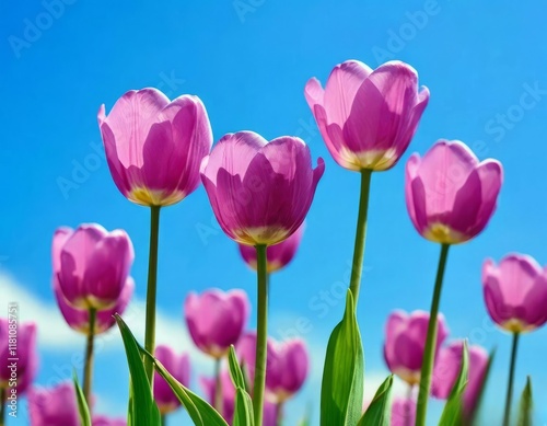 © Wajeeb, Obraz premium tulips with rich green leaves and a warm abstract blue background