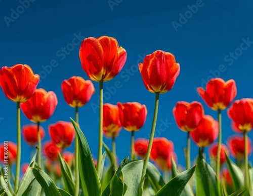 © Wajeeb, Fototapeta premium tulips with rich green leaves and a warm abstract blue background
