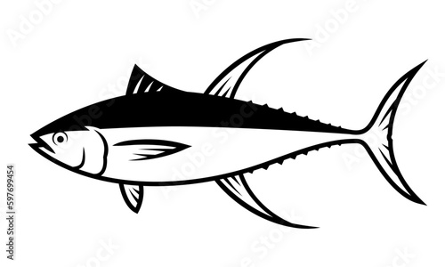 Fototapeta premium Tuna fish drawing with black blush lines, aquatic animal illustration on white background.